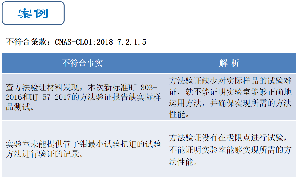 這2個不符合都是在進行試驗驗證時,在個別方面偏離了方法標準的要求。嚴格意義上說這不算是對標準方法的驗證,如果實驗室打算長期偏離標準方法操作,應按非標申請認可,并做方法確認。準則的7.2.2.1規定,對修改的標準方法要進行確認。對標準方法的驗證不應該有偏離標準要求的情況出現。