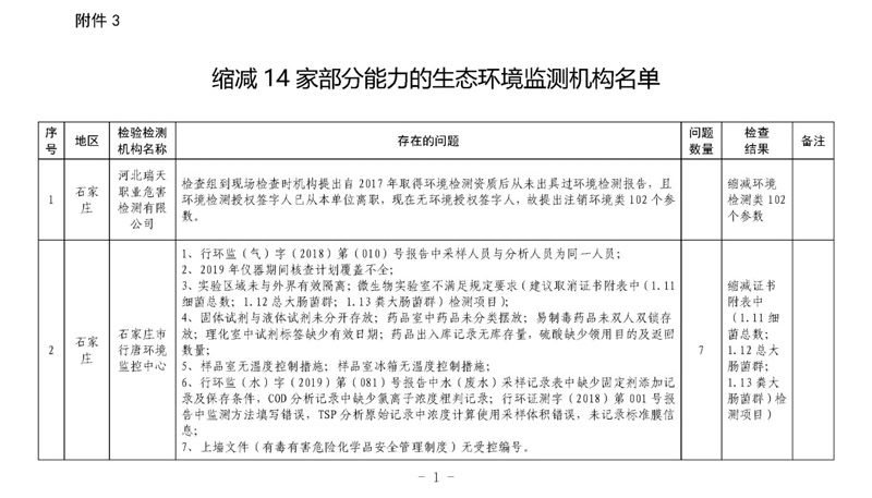 1 | 石家莊 | 石家莊市晉州環境監控中心 | 19 | 整改(暫停) |