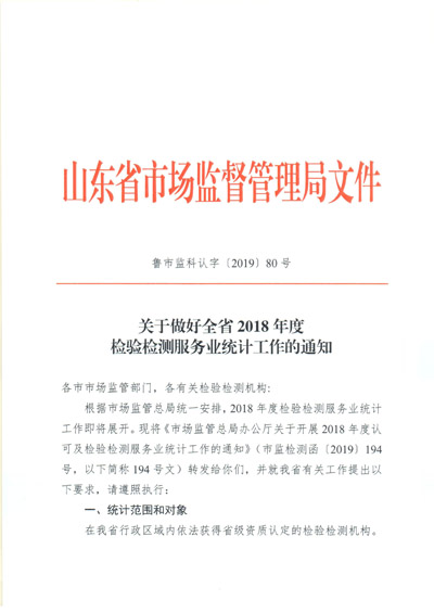關(guān)于做好全省2018年度檢驗(yàn)檢測服務(wù)業(yè)統(tǒng)計(jì)工作的通知(魯市監(jiān)科認(rèn)字[2019]80號(hào))